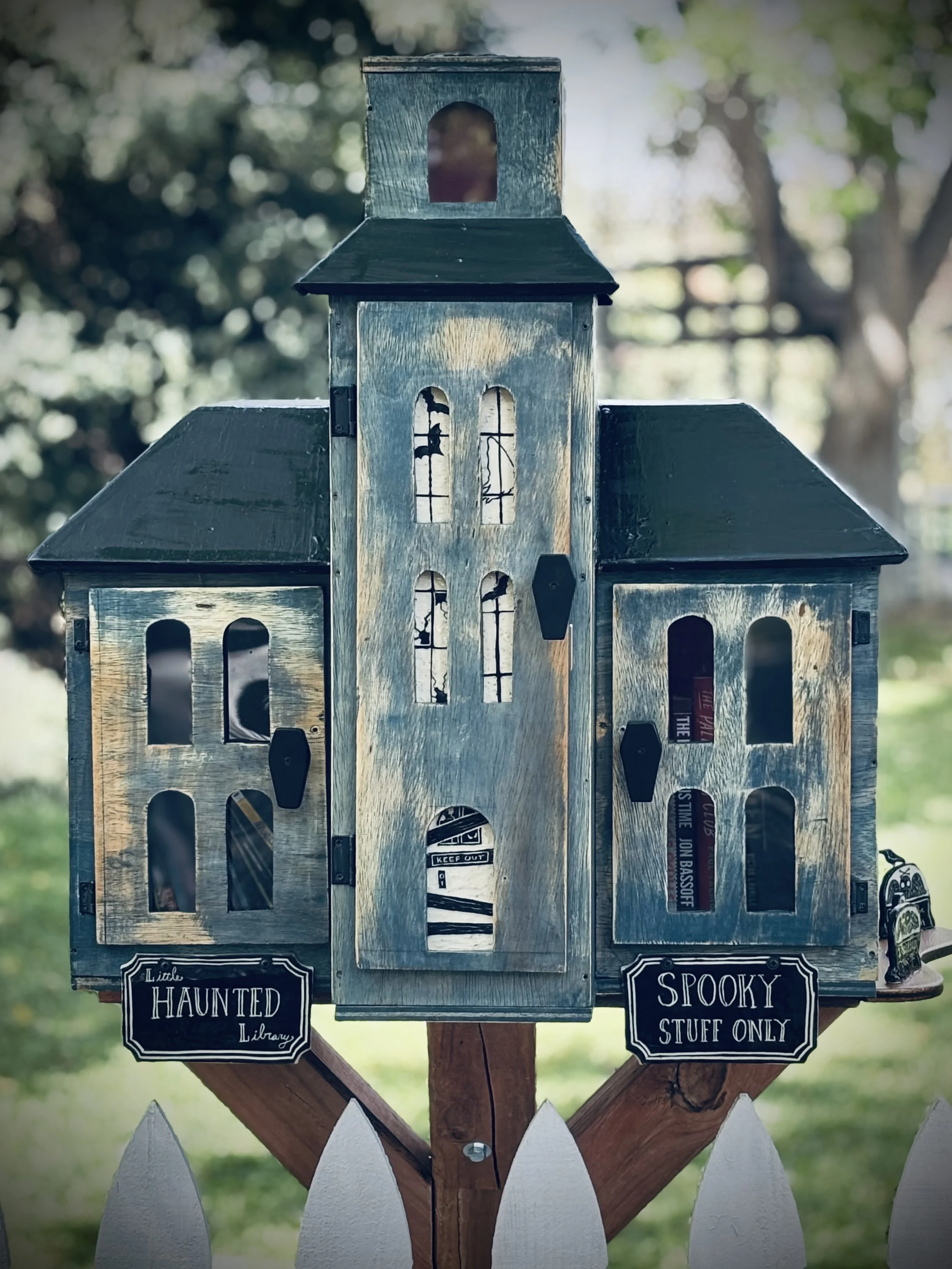 Once completed, the Little Free Spooky Library was stocked exclusively with creepy, mysterious, and spine-tingling reads and installed publicly in the community just in time for Halloween. It stood as a perfect example of mini architecture at its finest, showcasing both craftsmanship and creativity.